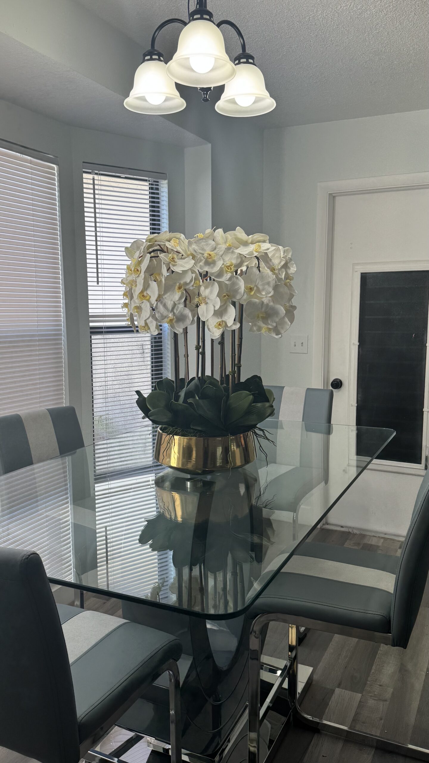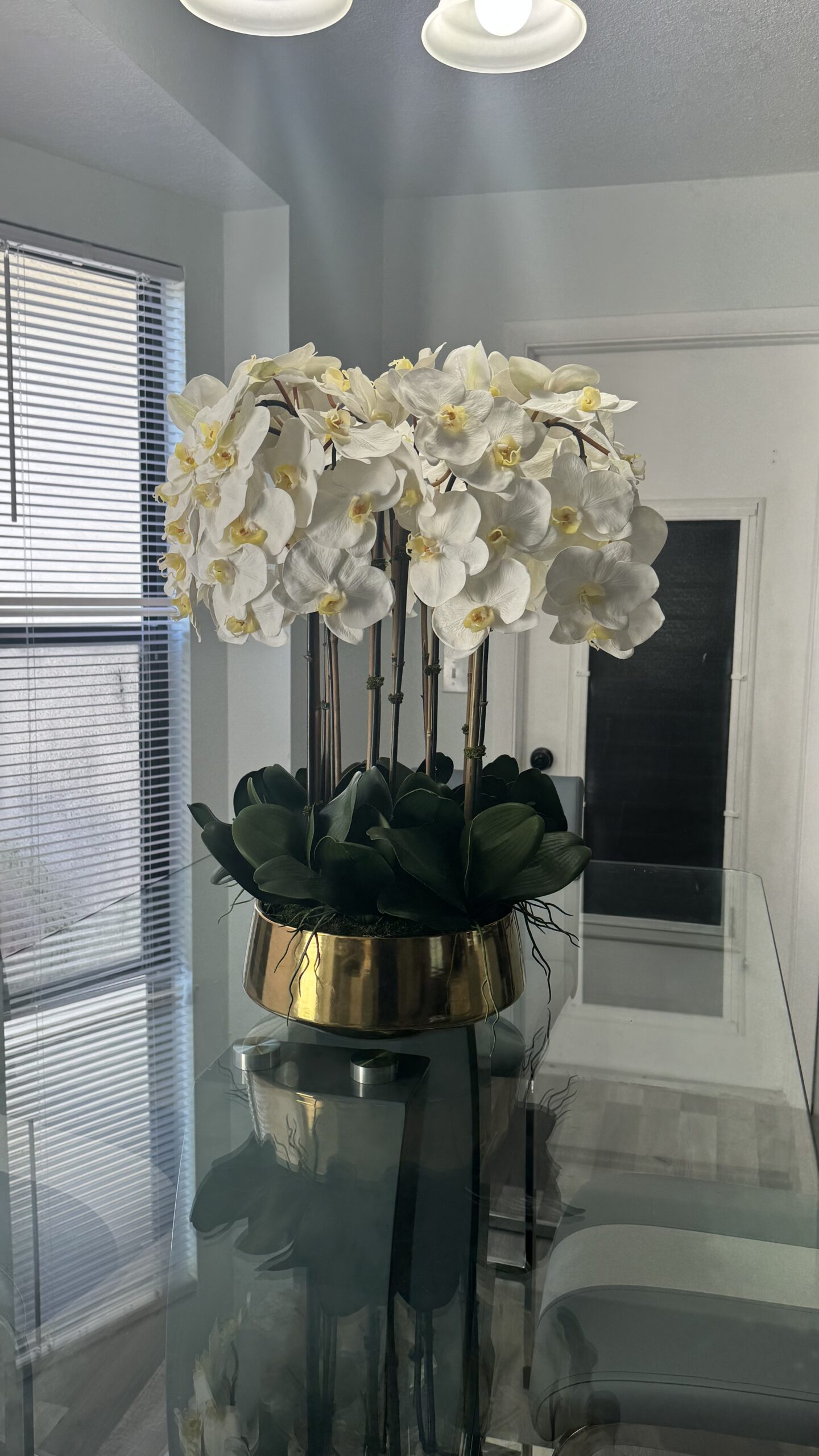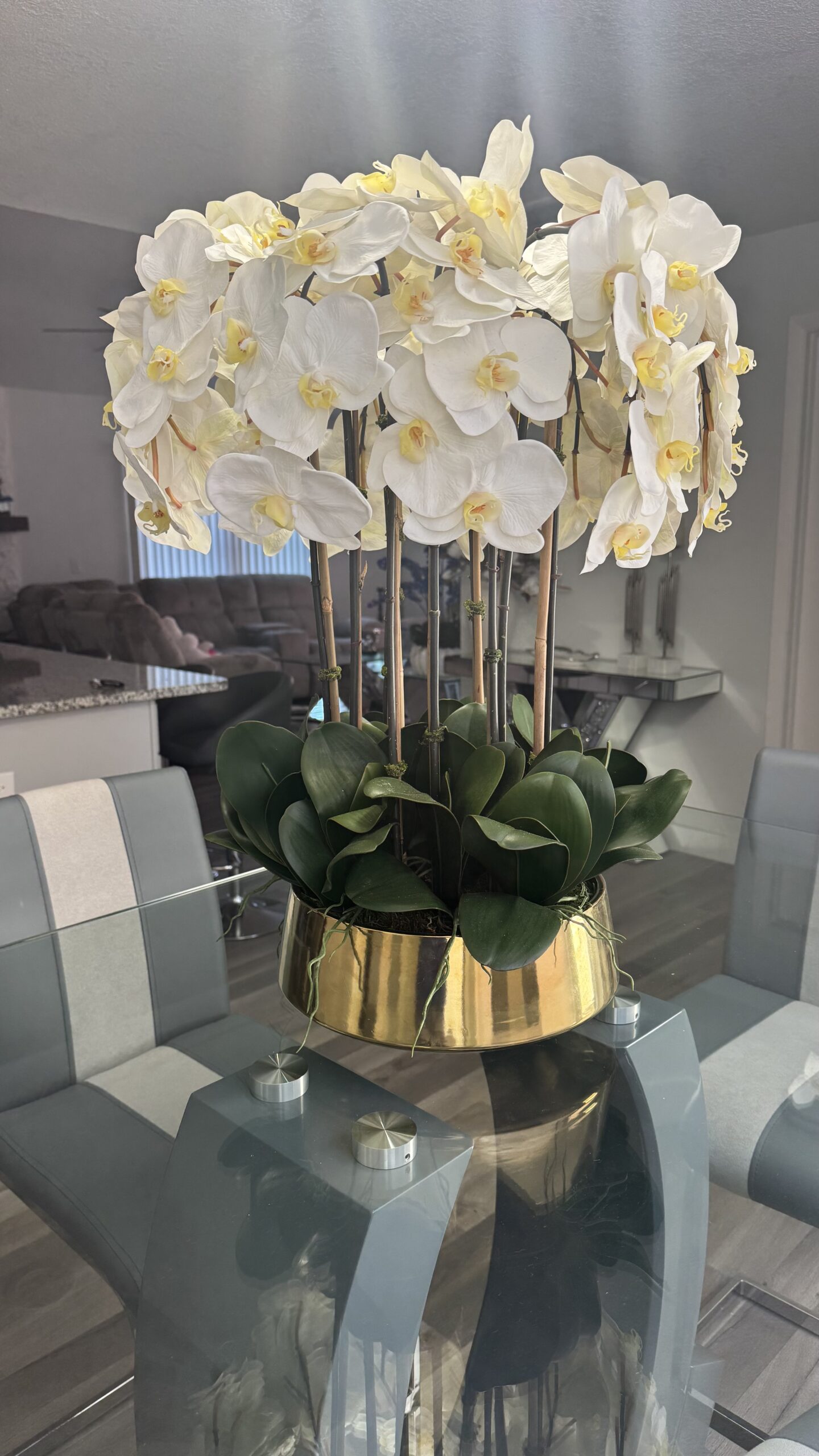Elevate your space with this stunning decorative piece that blends natural elements with modern sophistication. Pristine white orchids, known for their elegance and serenity, are artfully paired with natural bamboo stalks, adding a fresh, organic touch. The arrangement is anchored in a gold mirror-finish base that brings a contemporary and luxurious glow to the overall design.